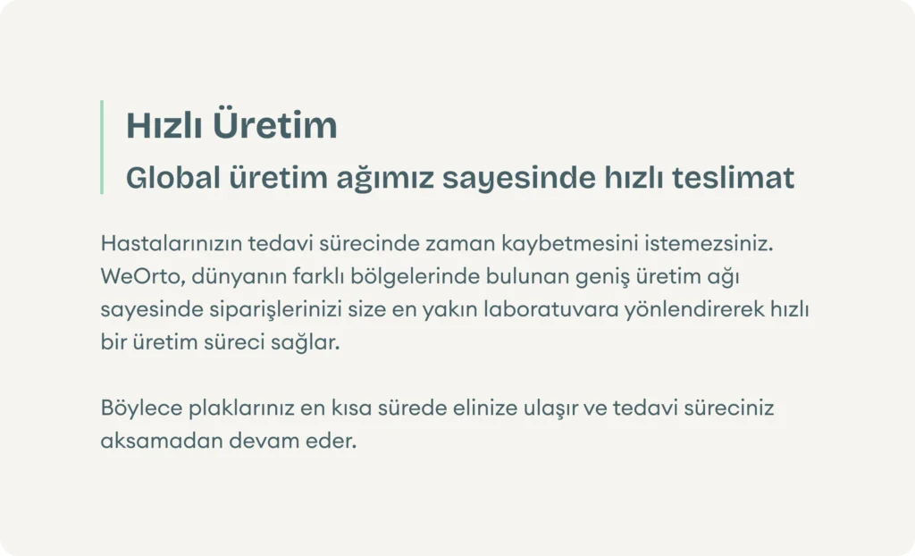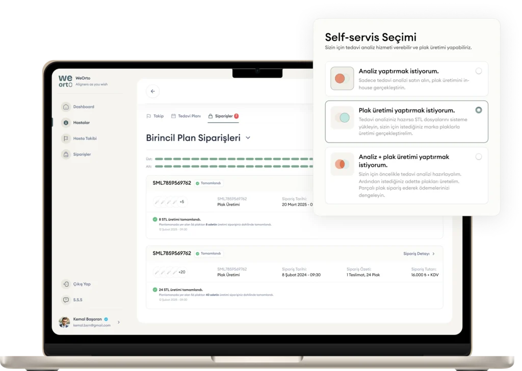 Planlama, analiz ve üretim aşamalarını tek bir paketle çözüme kavuşturun, zamandan tasarruf edin. WeOrto ile pratik, eksiksiz ve güvenilir bir tedavi süreci sizi bekliyor!