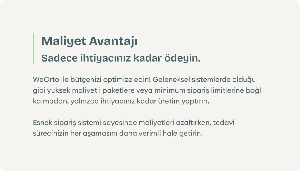 WeOrto ile üretim sürecinizi kendi ihtiyaçlarınıza göre şekillendirin. Plak sayısını, markasını ve malzemesini siz belirleyin. Toplu alım zorunluluğu olmadan, hasta bazlı üretim yaparak stok yönetimini kolaylaştırın.